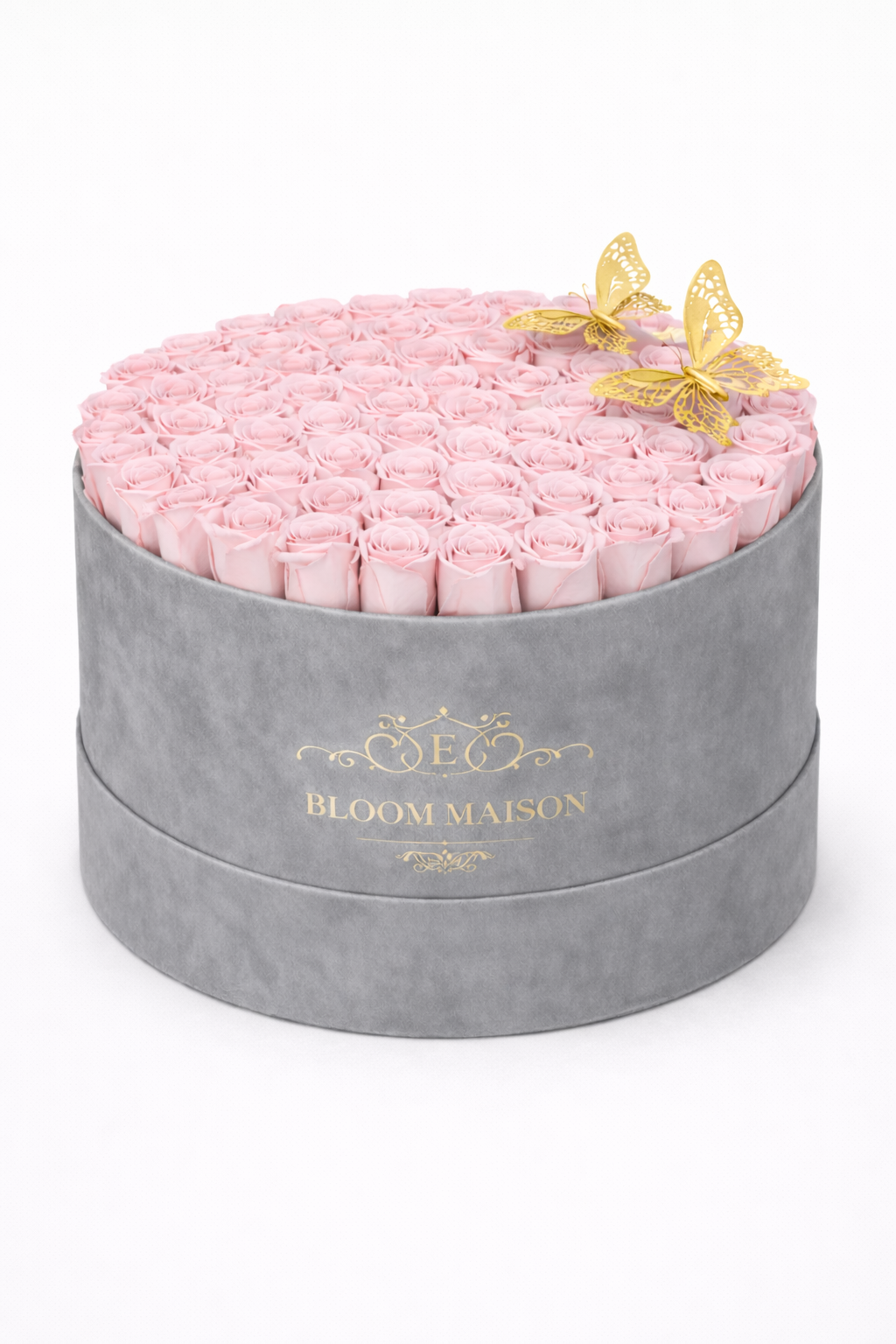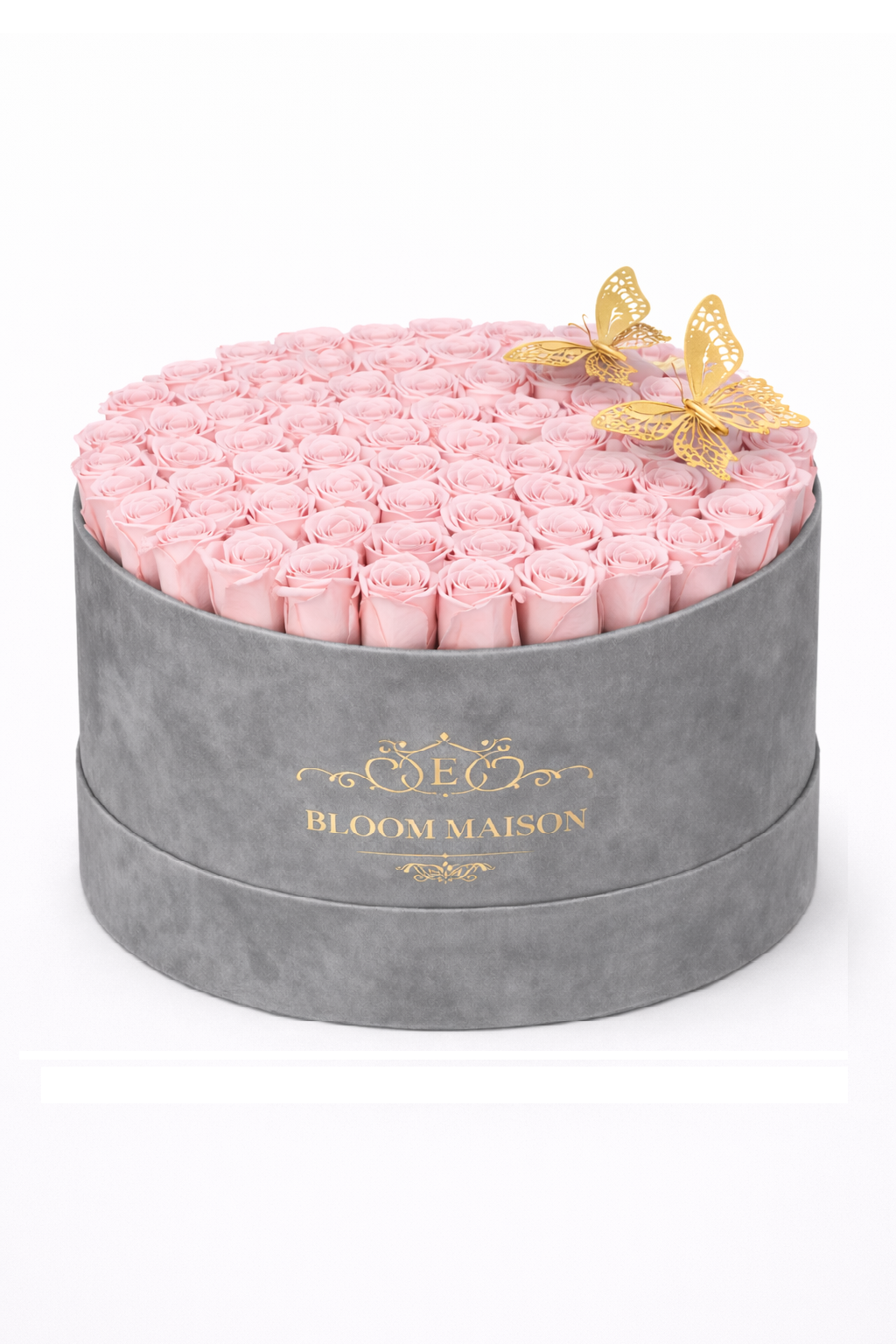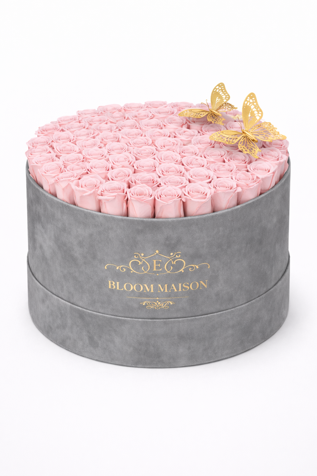 Our La Muse arrangement celebrates timeless beauty with a dome of blush pink roses, each hand-selected for its delicate hue. These 100 blooms are artfully nestled in a grey suede hatbox and accented with golden butterfly ornaments, creating a sculptural centerpiece that is both romantic and refined.