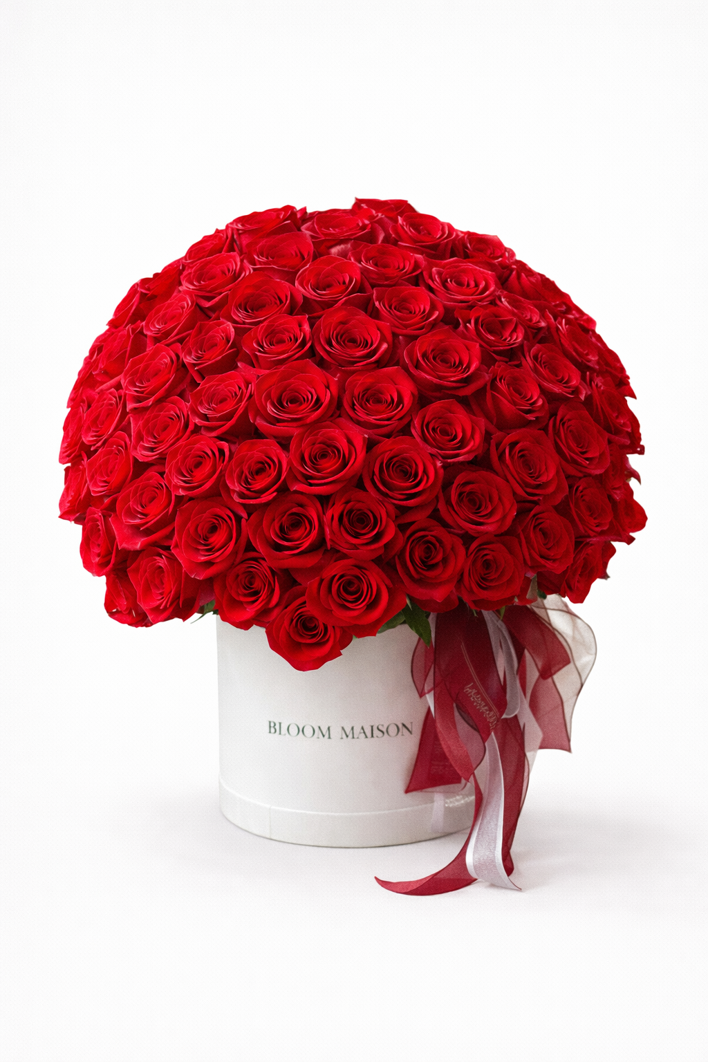 L’Amour Suprême –– Luxury Rose Box features a breathtaking dome of premium long-stem red roses, hand-selected and arranged by our master florist in Miami. Each rose is placed with precision to create a full, sculptural silhouette, presented in a refined white luxury hat box and finished with flowing silk ribbons.